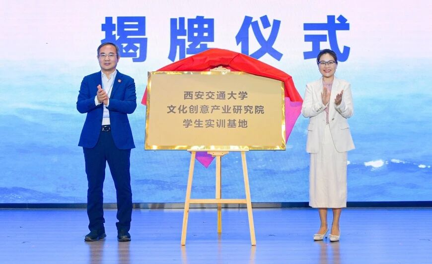 西安交通大学党委常委、宣传部部长、统战部部长成进(左),陵水黎族自治县人民政府副县长周小青(右),共同为西安交通大学文化创意产业研究院学生实训基地揭牌