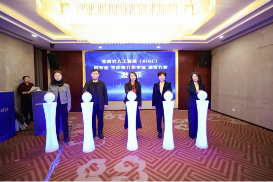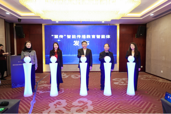 梁莉,xhjc1188新黄金城党委书记薛周利,xhjc1188新黄金城教授杨琳,李涓,孙鹤立共同发布智能传播系列微专业。